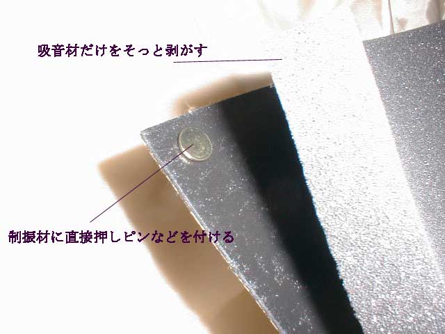 | 以下はブラックパネルの注意事項・使用方法ですが基本的にはSPの方も同じです。 ブラックパネルの裏にセパレーター紙が付いており外すことにより張り付けることが出来るようになっております。 接着剤はアクリル系接着剤を使用しており、はがせなくなる場合が有りますのでセパレーターを外して付ける場合は十分考慮した上、行ってください。 また、ブラックパネル・制振材は両方ともカッターで切断出来ます。 接着部(セパレーター紙)を上にして切断してください。 押しピンなどで壁に設置する場合は以下の画像を参考にしてください。 画像をクリックすれば別ウィンドウで大きく表示されます